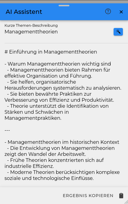 Der AI Assistent hilft dir dabei, Folien für ein komplettes Slidedeck für die digitale Lehre zu erstellen. Es genügt, ein Thema und – falls gewünscht – die Überschriften für einzelne Folien anzugeben.